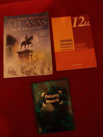 1.visuotinis istorijos atlasas mokykloms 6lt 2.lietuviu literaturos konspektas abiturientui, rasytoju kurybos apibudinimai, tekstai ir klausimai 6lt 3.pazymiu knygeles aplankalas 1lt :)