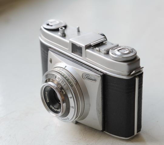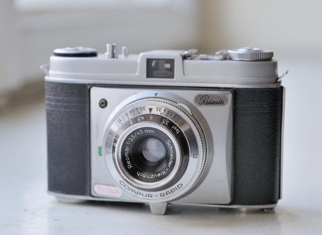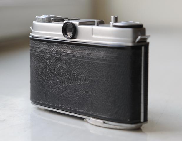 Juostinis retro fotoaparatas Kodak retinette su objketyvu Reomar 45mm/3,5. Yra originalus odinis dėklas.