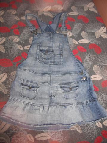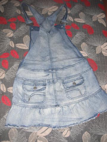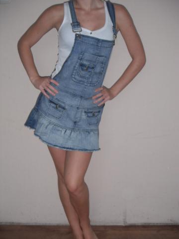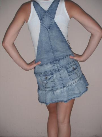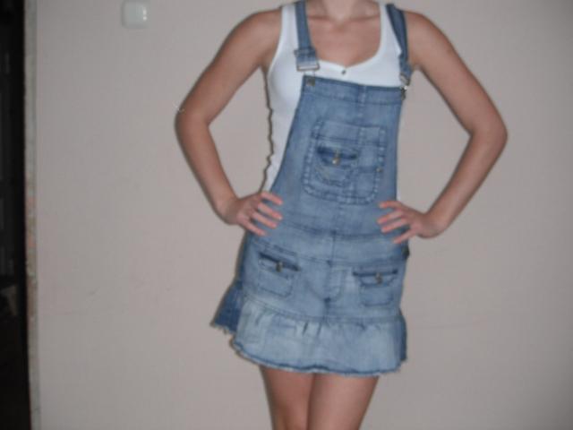 Džinsinis kombinezonas, mėlynos spalvos. Yra reguliuojamos petnešėlės. S/M dydis. Naujas.