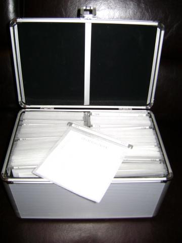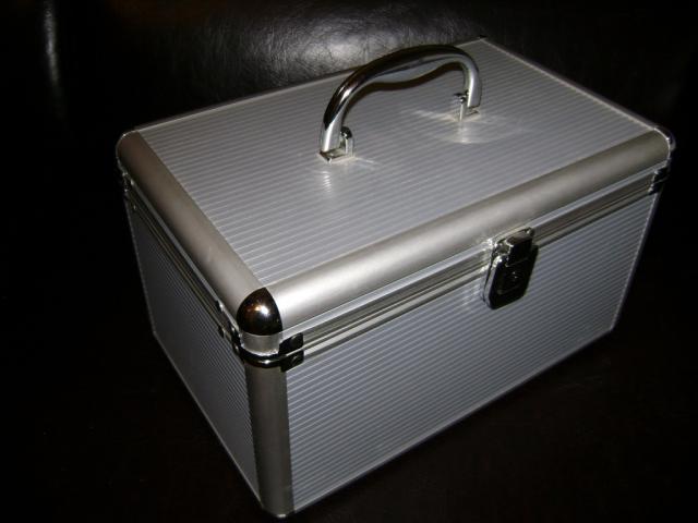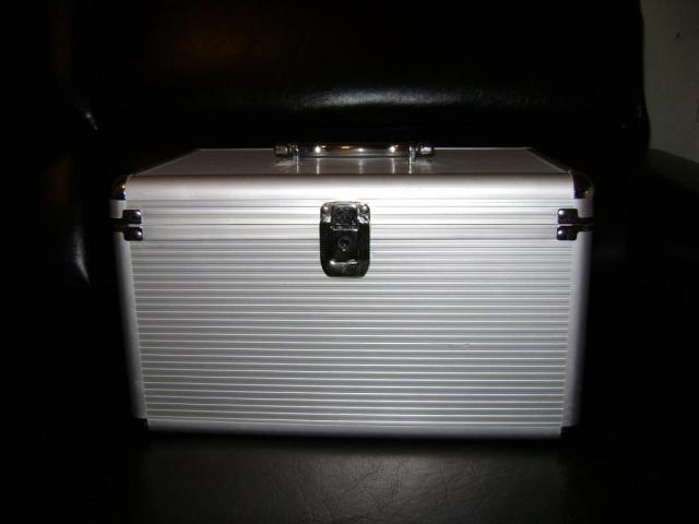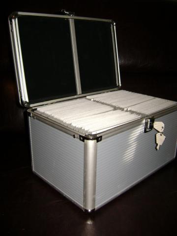 Aliuminė kompaktinių diskų skrynelė, telpa 200 vnt. kompaktinių diskų, užrakinama, yra 2 raktai.