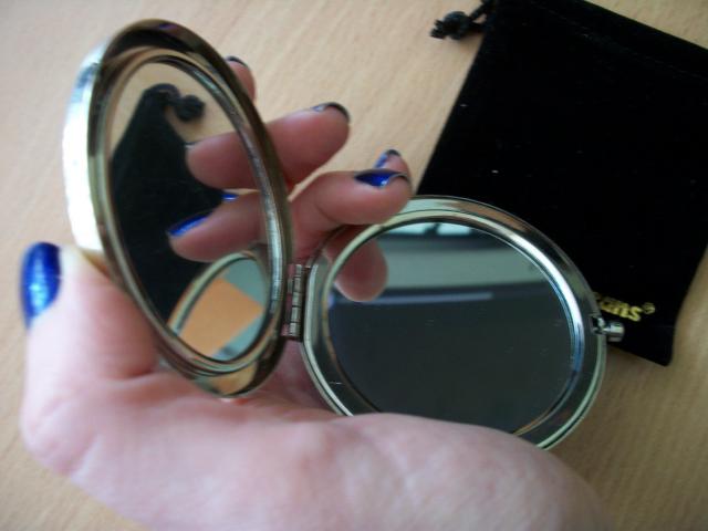 Naujas, kompaktiškas veidrodėlis su dėžute. Viena pusė didina, kt paprasta, yra barchatinis maišelis veidrodėliui nešioti. +5lt siuntimas neskubus, +7lt skubus