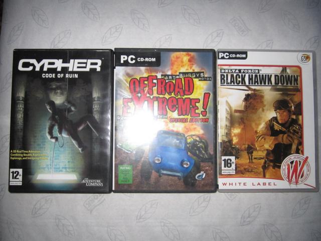 Labai idomus ir ilgai neatsibostantys kompiuteriniai PC zaidimai. Trys vienetai: 1) "Black Hawk Down: delta force", 2) "Cypher: code of ruin" ir 3) "Offroad Extreme!: quads, baja, atv, karts, motox, buggys". Vienas zaidimas "Cypher: code of ruin" turi knygute-instukcija (matosi nuotraukose Nr. 4 ir Nr. 5). Vieneto kaina: 5€