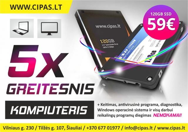 Kompiuterio darbo pagreitinimas + NEMOKAMAS keitimas ir kiti priedai Lėtai veikia kompiuteris? Norisi jį mesti per langą? Nusiramink, mes turime super pasiūlymą, sumokėk už 59 Eur ir tavo kompiuterį padarysime net 5 kartus GREITESNĮ! + NEMOKAMAI: • 120GB SSD keitimas • Antivirusinė programa • Diagnostika • Windows operacinė programa • Visų darbui reikalingų programų diegimas Atliekame visus kompiuterių remonto darbus. Keičiame ekranus, lituojame čipus, tvarkome išlaužtus lizdus, remontuojame su