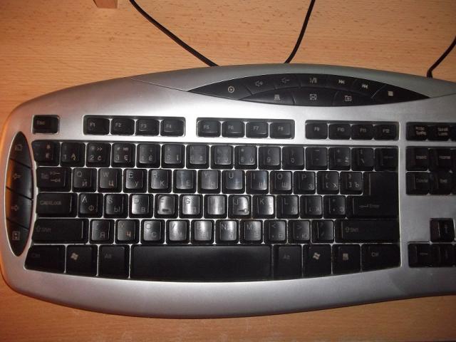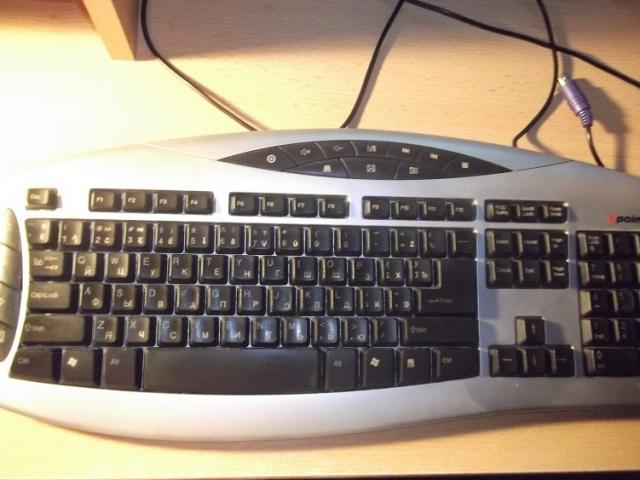 Kompiuterinė klaviatūra Xpoint, pilkos spalvos. Yra 3 kalbų raidės: lietuvių, rusų, anglų.