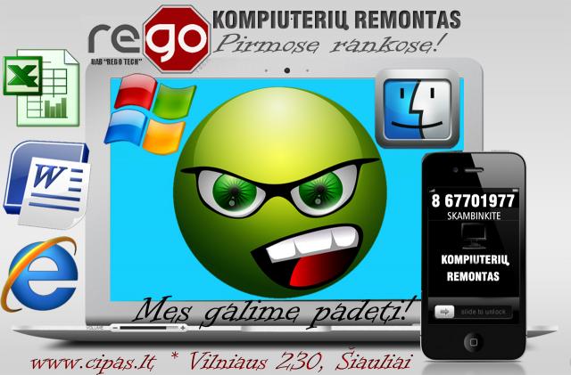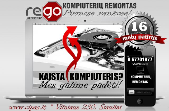 Remontuojame nešiojamus ir stacionarius kompiuterius: • Remontuojame ir keičiame sudaužytus, neveikiančius ekranus; • Klaviatūrų keitimas, tvarkymas; • Keičiame mikrochemas, čipus ir kitus komponentus; • Instaliuojame tvarkykles ir operacines sistemas; • Išvalome „šiukšles“ iš Jūsų kompiuterio (trojan, virusai ir kt.) • Remontuojame pagrindines kompiuterio plokštes; • Taip pat taisome, prekiaujame, kompiuterio kroviklio laidus, kištukus. • Dulkių valymas iš pačio kompiuterio; • Aplietų kompiuterių