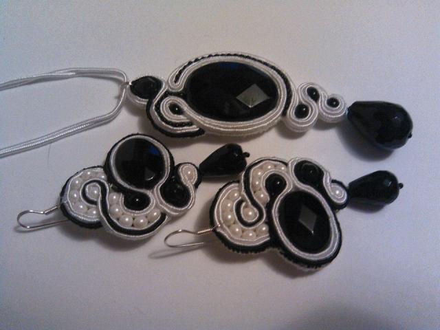 Rankų darbo pakabukas su auskarais iš sutažo juostelės su karoliukais