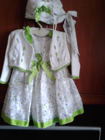 Parduodam puikios bukles, praktiskai nauja komplekta mergaitei. Komplekta sudaro: zalia suknele, megztinis ir kepure. Ugis 68cm. +37067493600