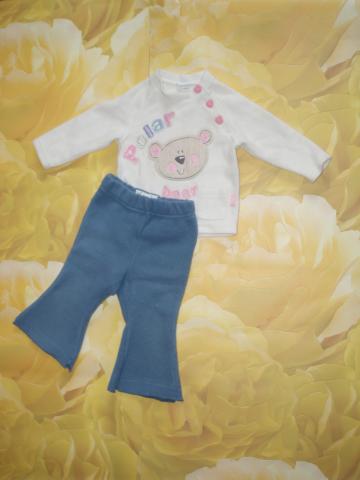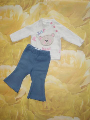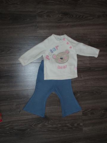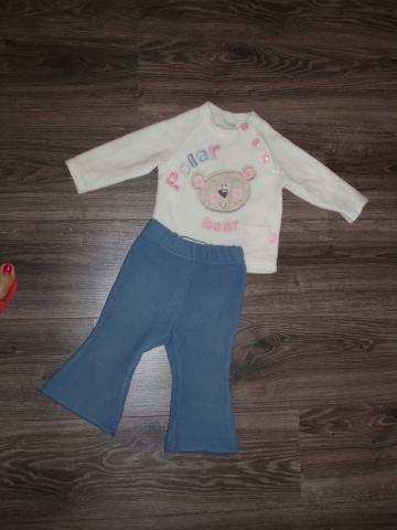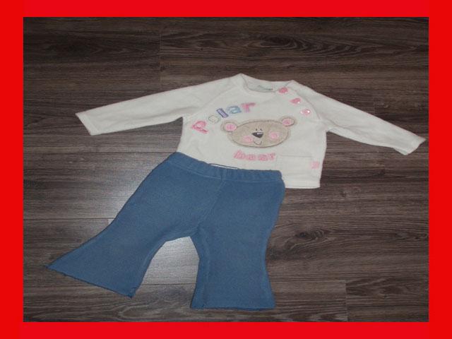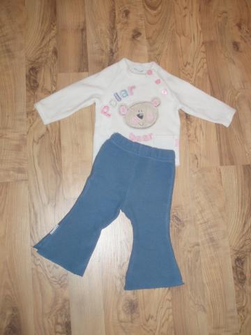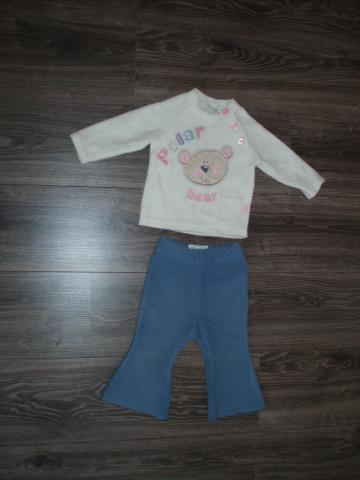 Šiltas megztukas kūdikiui. Rankovyčių ilgis ~ 30cm (rankovytės viršus) ir ~ 17 cm (rankovytės apačia - nuo pažasties), megztuko ilgis ~ 32cm, megztuko apačia ~ 52cm, per liemenį ~ 55cm. Kelnyčių ilgis ~ 41cm, vidinio rieto ilgis nuo klyno ~ 24cm, iki klyno ~ 18cm. Per liemenį ~ 36cm (dar tempiasi). Kelnyčių dydį rašo 74. Papildomos sąlygos: + siuntimas 2LT (papr.), 4LT (reg.)