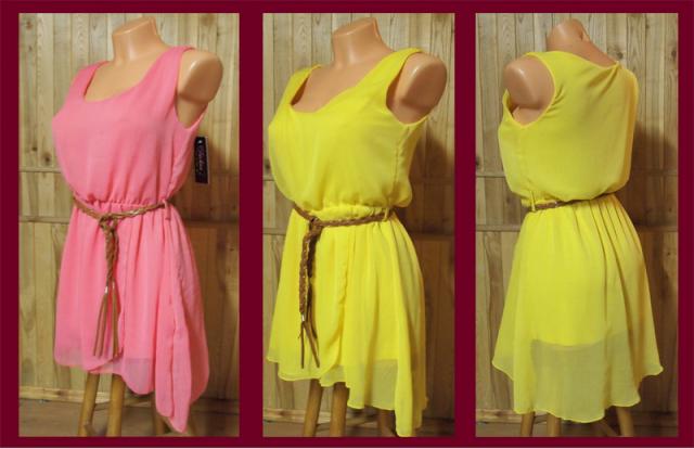 Koralinė ir geltona suknelė priekis trumpesnis, ilgis nuo krutinės - 60cm, iš nugaros - 85cm