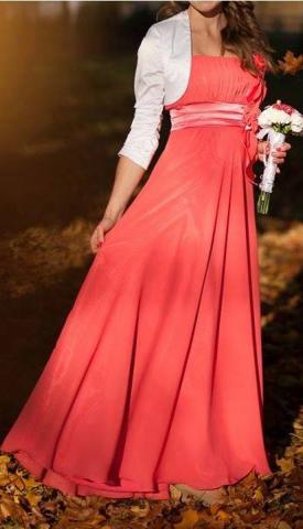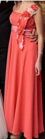 Parduodama koralinės spalvos proginė suknelė. Suknelė buvo užsidėta tik vieną kartą, be jokių defektų. Labai lengvos medžiagos, gėlytės nusisega arba galima prisegti kitoje vietoje, nugaroje suknelė reguliuojasi šniuriukais. Suknelės ilgis buvo koreguotas pagal merginos ūgį (+- ūgis 162). Suknelė yra ant petnešėlių. Kaina galima derinti p.s. jei reikia galiu švarkelį pridėti už tam tikrą kainą :)