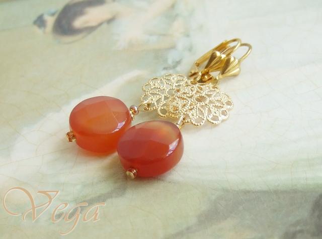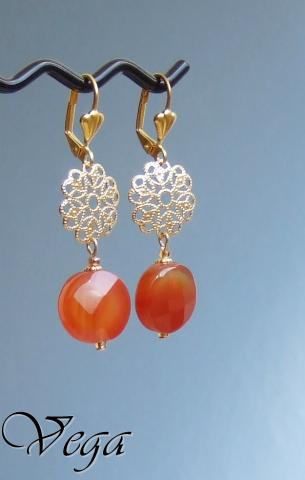 Korneolis. ilgis su užsegimu 5 cm. Geltonas metalas. Korneolis- akmuo, norinčiam susirasti ir išlaikyti meilę.