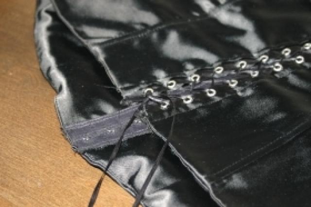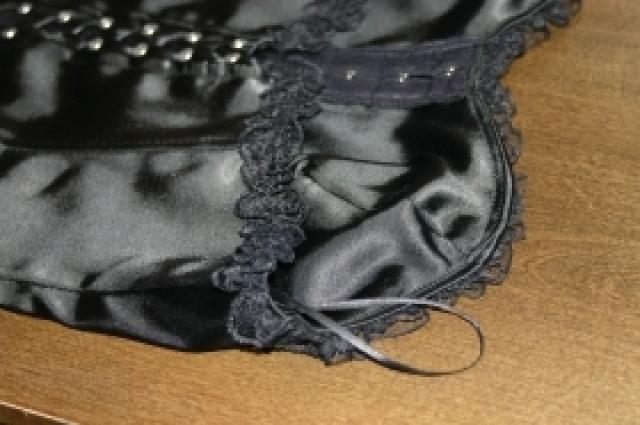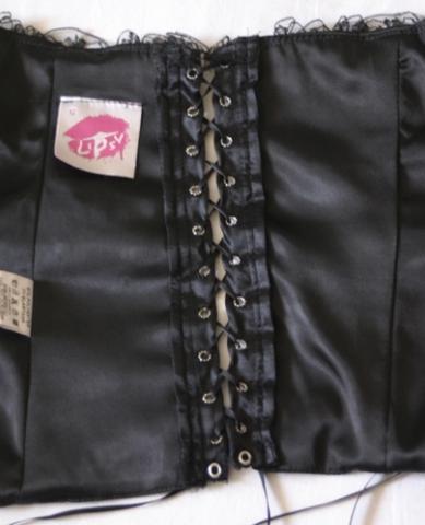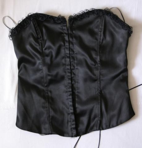 Juodas, atlasinis. Prieky susegamas, nugaroj reguliuojamas juostele. 12d. Defektas: siek tiek paire gale, kur juostele reguliuojamas dydis.