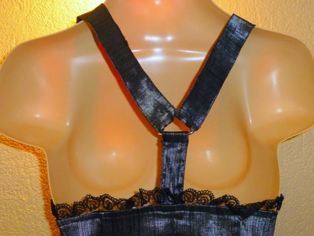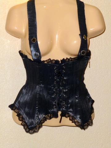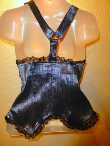 Švelnios blizgios pilkai sidabrinės spalvos korsetas puoštas juodais nėrinais, raišteliais ir sagutėmis.