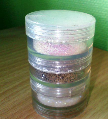 Yra 3 atspalvių, dėžutė aplūžus, bet blizgučių dar laabai daug.