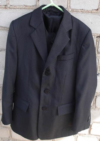 3 dalių juodas su dryželiais kostiumas 134 cm dydžio.