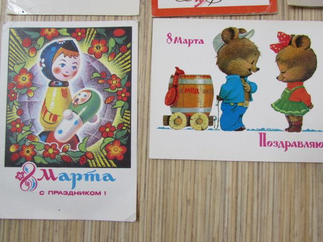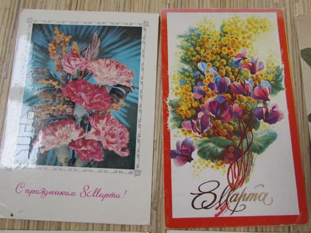 Vieno atvirukao kaina 1 euras. Iš kairė į dešinę nuo viršutinės eilės - blizgus atvirukas, su gvazdikais ir kt. gėlėmis - 1979 m. užrašytas, su štampu, siųstas paštu. Dvigubas - su raudonu rėmeliu, su ciklamenais - 1985 m. Foto su rožėm ir jazminais - neužrašytas, 1974 m. Dešinysis viršuje, mėlynas ornamentuotas - nenaudotas - 1969 m. Su lėlyte ir kūdikiu nenaudotas, bet kiek pasiglamžiusiais kampais - 1975 m. Su meškiukais - 1982 m. Su narcizais ir kt. gėlėmis - naudotas, siųstas paštu iš Minsko, su štampu