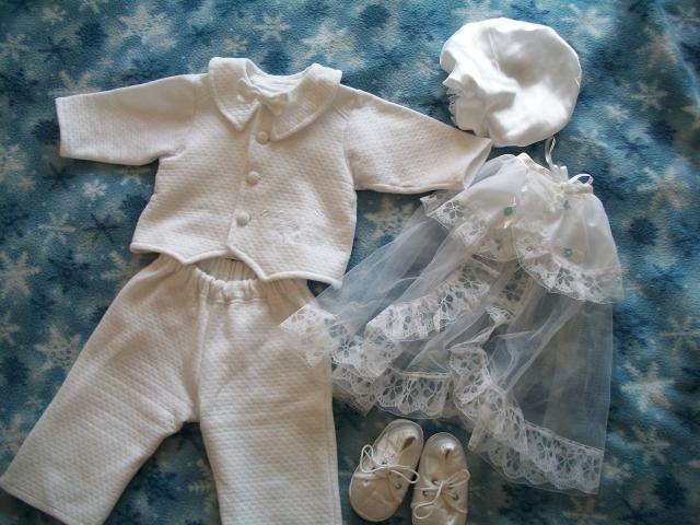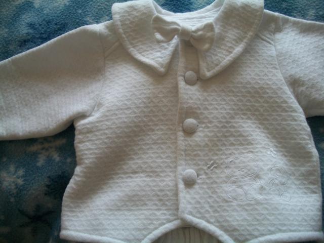 Kelnės 35 cm (nuo klyno 22 cm), švarkelis (rankovė nuo pažasties 17 cm), batukai 13 cm, kepurė ir skraistė.
