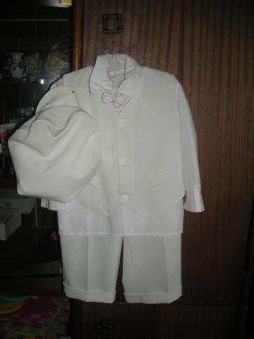 Beveik nauji, vieną kartą tedėvėti rūbeliai krikštui, 86 cm ūgio berniukui. Iš 4 dalių - marškinėliai, kelnės, liemenė, kepurė ir varytė.
