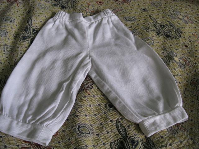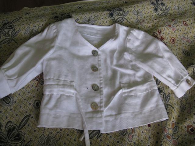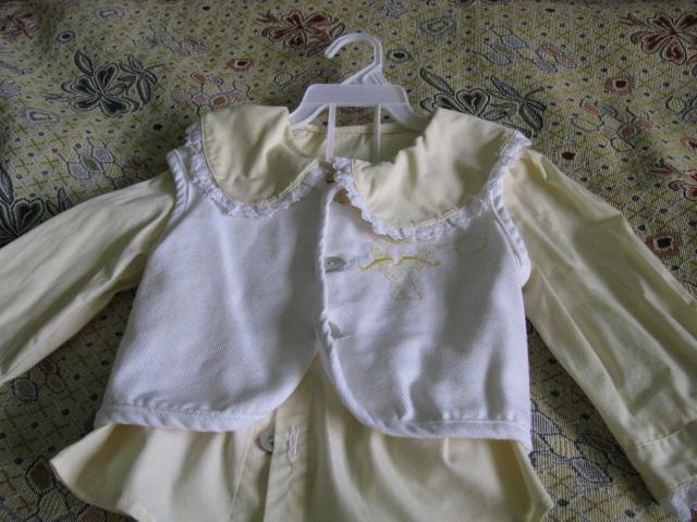 Llininis krikštynų kostiumėlis berniukui: storesnio lino kelnytes, liemenė ir švarkelis ir plono lino gelsvi marškinukai. Ant liemenės ir švarkelio išsiuvinėti angeliukai. Kelnytes: visas ilgis - 39 cm., nuo klyniuko iki kelnių apačios - 22 cm.., liemens plotis 21 cm. (yra gumytė). Švarkelis: ilgis - 35 cm., plotis - 33 cm., rankovė nuo petuko - 25 cm., nuo pažasties - 16 cm.