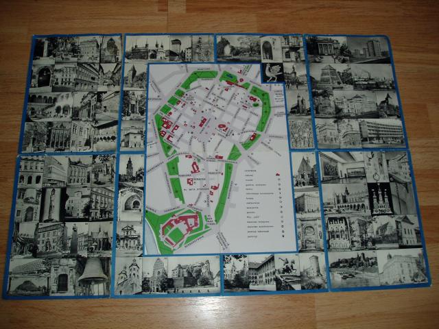 (le texte et le plan ci-dessus montrent la reproduction des monuments historiques ou contemporains de Cracovie se trouvant au dos de la carte touristique) prancūzų k.