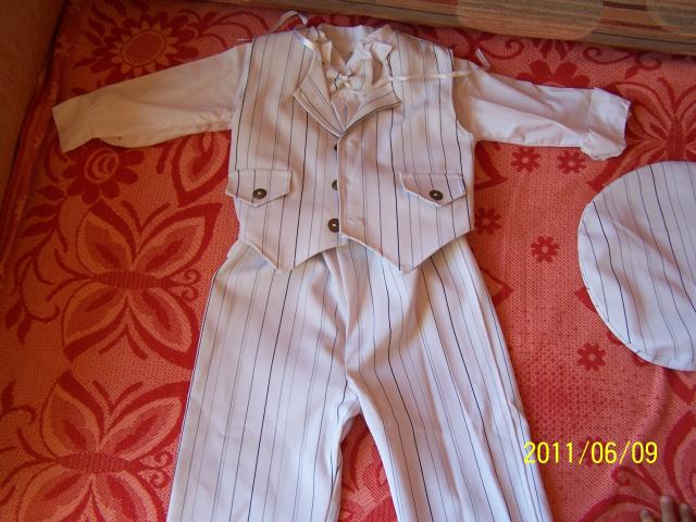 74 cm ugio berniukui, buvo uzdetas tik 1 karta. kostiumeli sudaro: balti marskiniai, drizuotos kelnes, lemene, varlyte ir kepuryte.