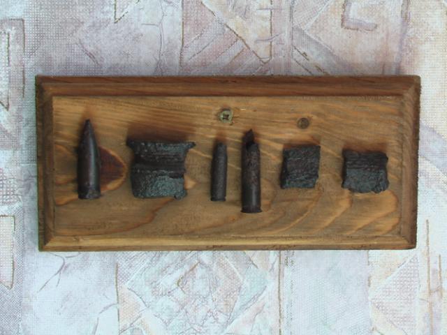 Antro pasaulinio karo kulkos ir skeveldros, viskas pritvirtinta ant medinio rėmelio.