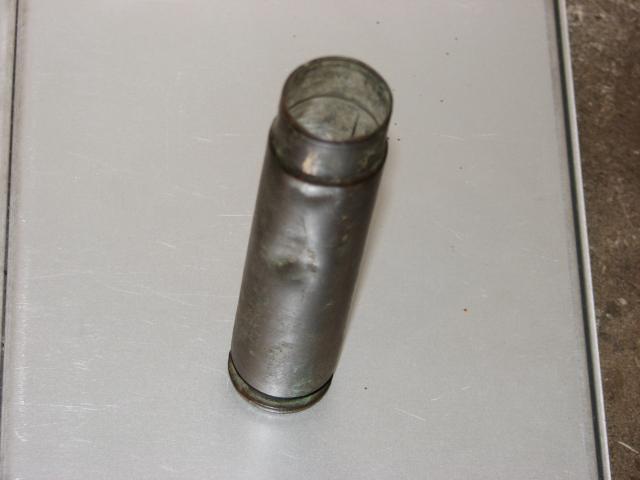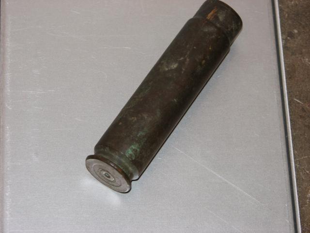 II P.K. Kulosvaidžio gilzė rasta žemaitijoje. Metalas - žalvaris. Skersmuo 26mm, ilgis 115mm.