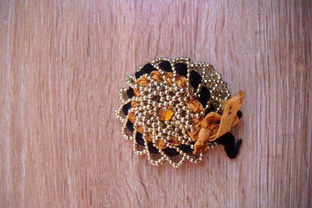 Iš auksinių karoliukų suvertas papuošalas kuodukui formuoti.