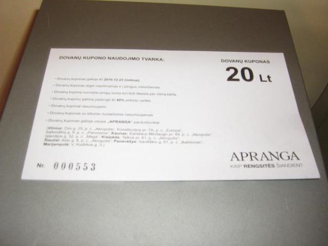 Tai ,,Aprangos" dovanų kuponas, kurio vertė 20 Lt. Kuponas galioja iki 2010 m. gruodžio 23 d.