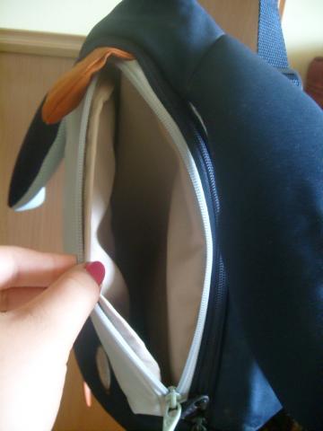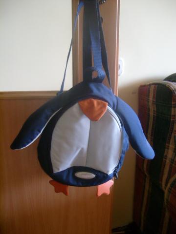 Labai smagi ir miela kuprinytė. Naudota labai labai mažai ir tai saugota ir mylėta. "Pingvino" nosį suspaudus jinai sucypia :D Dviejų skyrių, "Samsonaite" firmos. Yra mažiukas defektukas- ties petneša vos vos yra pairus medžiagytė..