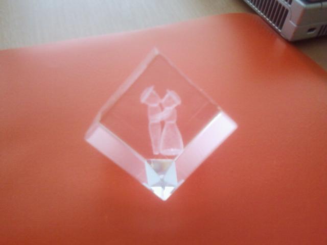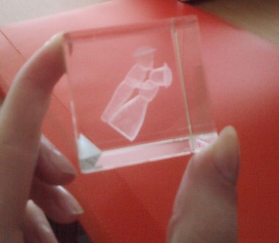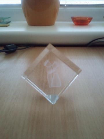 Kvadratinė krištolinė statulėlė, stovinti kampu, viduje - berniukas ir mergaitė.