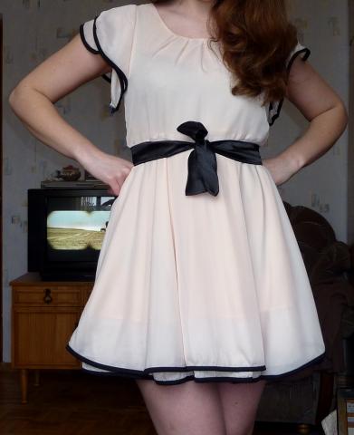 Labai daili dramblio kaulo spalvos suknutė. Ilgis apie 75cm, liemuo apie 80cm, bet surišama dirželiu tai tiks daugeliui. Kaina 60lt (galima derėtis)