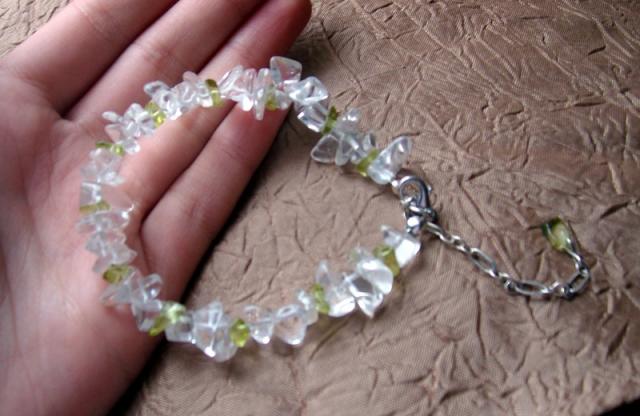 Labai gražiai ir prabangiai ant rankos atrodanti apyrankė ir skaidrių kalnų krištolo ir žalsvų skaldos karoliukų. Labai gražiai atrodo prie juodų drabužių. Yra prailginanti grandinėlė su žalsvu karoliuku pabaigoje, todėl tiks bet kokio dydžio rankai :)