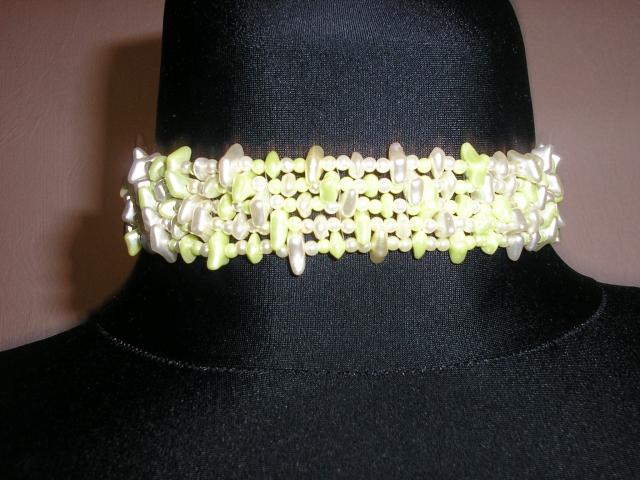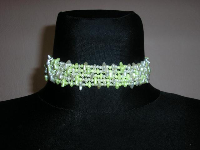Labai grazus kaklo papuosalas is perliuku. Spalva sviesiai zalia su balta. Ilgis 39cm, plotis 2cm.
