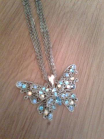 Labai grazus, blizgantis kaklo papuosalas su drugeliu. Taip pat prie jo yra auskariukai - drugeliai.