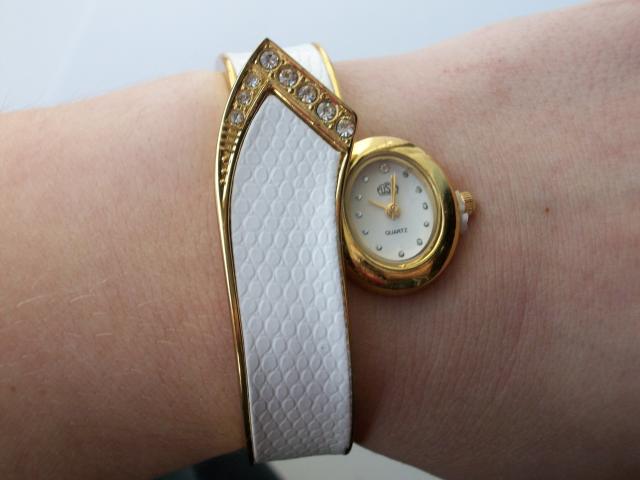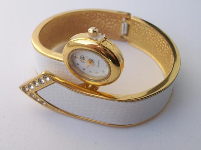 Labai gražus moteriškas laikrodukas. Atlenkus apyrankę labai patogiai užsideda. Skersmuo apie 5,5 cm. Ten kur balta gyvatės odos imitacija:)