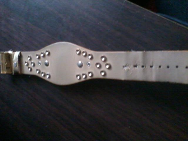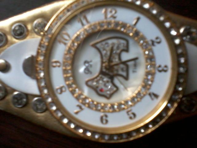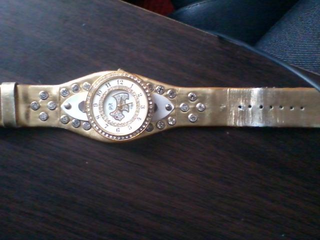 Auksines spalvos laikrodis su suniuku. neiskrites nei vienas akmenukas. Yra 2 defektai: nusitrynes dirzelis, kartais laikrodis persisuka (skaiciai)