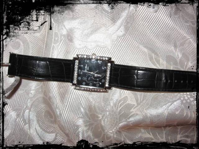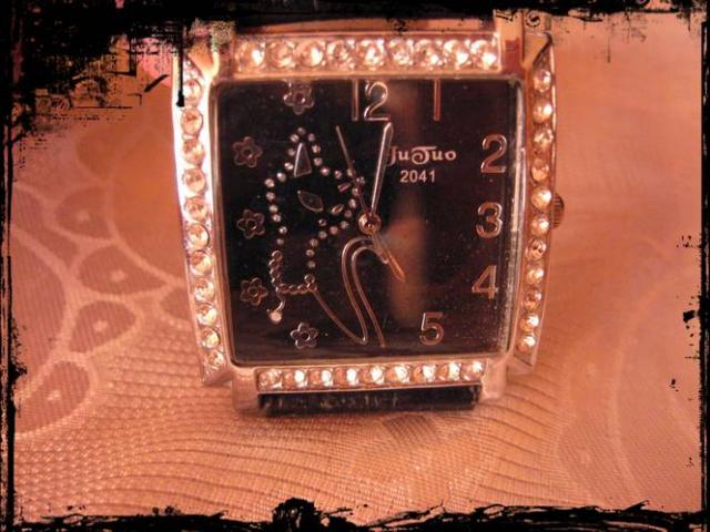 Juodas laikrodis, kuriame pavaizduota katė. Labai gražiai atrodo. Tik dirželis yra pro kurį reikia prakišti laikrodžio didįjį dirželį - suplyšęs.