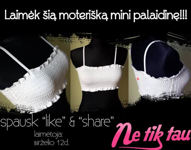 Konkursas! Laimėk moterišką mini palaidinukę!! Padaryti reikia labai nedaug: tiesiog spausk "like" ant šios grupės puslapio, bei "share" ant šios nuotraukos (nepamiršk patikrinti, ar nustatymai yra "public"). Štai ir viskas! Palaidinukė yra S/M dydžio, baltos spalvos. Puikus rūbelis karštai vasarai! Laimingoji burtų keliu bus išrinkta Birželio 12d. Sėkmės mielosios! nuotraukos nuoroda: https://www.facebook.com/photo.php?fbid=531925693509597&set=a.528467630522070.1073741828.528067437228756&type