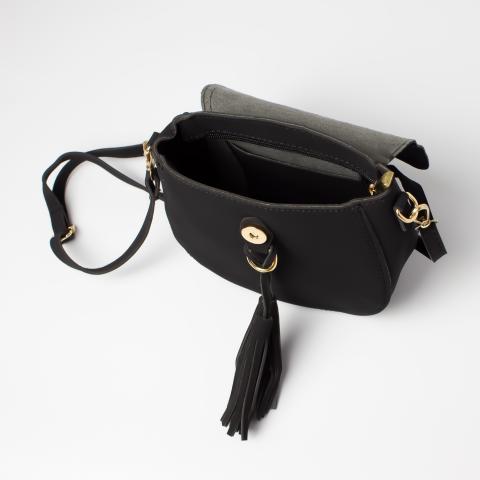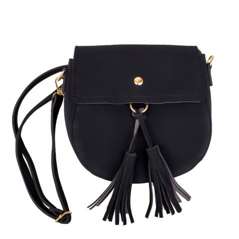 Laisvalaikio stiliaus juodos spalvos dirbtinės odos rankinė per petį su reguliuojamo ilgio dirželiu. Rankinei žaismingumo suteikia kutai. Lengvai užsegama užtrauktuku bei metaline sagute. Viduje yra vienas bendras skyrius susidėti visiems reikalingiausiems daiktams. Lengvai derinama rankinė prie bet kokio stiliaus aprangos. Rankinės matmenys: Plotis - 20 cm, Aukštis - 18 cm, Gylis - 7 cm.