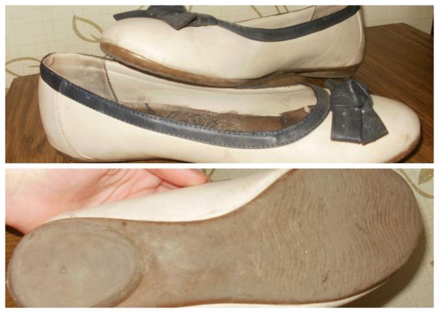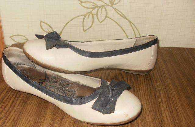 Dramblio kaulo spalvos laiveliai su mėlynu kaspinuku ir nedideliu kulniuku taip pat, padas yra guminis, taigi pavasarį per lietų tikrai nebaisu vaikščioti. Iš išorės atrodo kaip nauji, nė trupučio nenudrenkti, tik iš vidaus kaip ir nuotraukose matyti yra pajuodavęs padas, bet šią nedidelę problemėlę labai paprasta pataisyti. :)