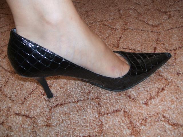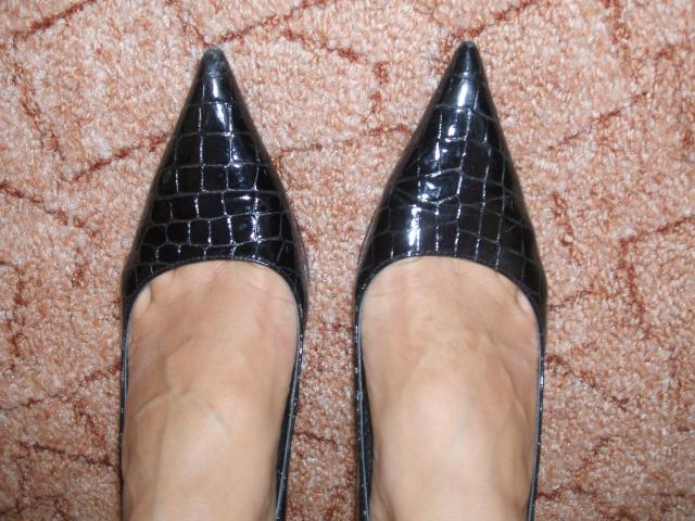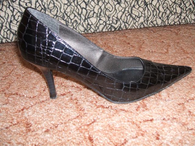 Puikios bukles klasikiniai bateliai, krokodilo odos imitacija. Plonas ne itin aukstas kulniukas, smailianosiai.