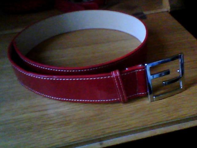 Lakinis, tikros odos, ryškus. Plotis 4.5 cm, bendras ilgis 94 cm, ploniausias susegimas 75 cm