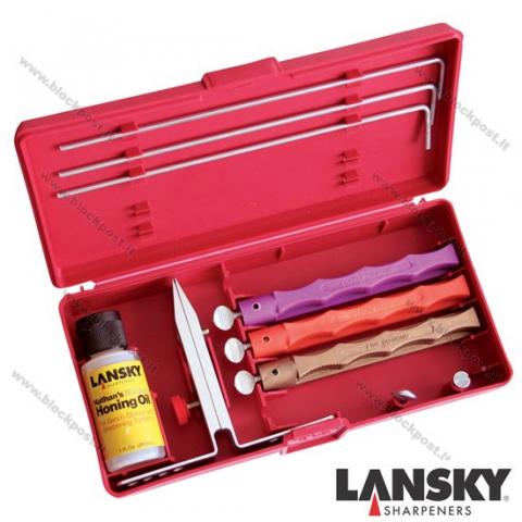Komplektą sudaro: 1. 3vnt. deimantiniai galandimo akmenis: violetinis - šiurkštus Diamond Hone (120 Grit) raudonas - vidutinis Red Medium Diamond Hone (280 Grit) šviesiai rudas - minkštas Fine Diamond Hone (600 Grit) 2. 3vnt. nukreipiamieji akmenims. 3. Peilio ašmenų fiksatorius. 4. Aliejus galandimui LANSKY SHARPENERS Nathan’s Natural Honing Oil 1 Fl.Oz. (29,6 ml). Trys lašai ant akmens prieš galandimą gerina galandimo kokybę ir padidina akmens ilgaamžiškumą. 5. Plastikinis dėklas.