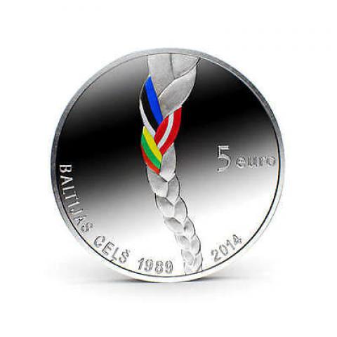 Labai graži Baltijos kelio 25 mečio proga išleista spalvota moneta. Nominali vertė: 5 EUR; 22 gramai,sidarbas, 925; 35mm diametras; Išleidimo metai: 2014; Tiražas: 10000vnt; Kokybė: proof.