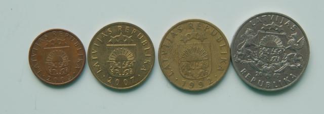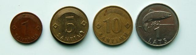 Latviškos monetos: 1, 5, 10 santimų ir 1 latas.
