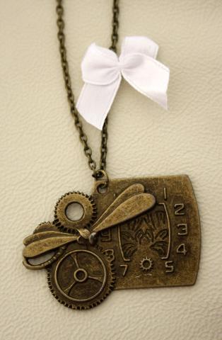 Naujas pakabukas su laumžirgio laikrodžiu. Padabintas baltu kaspinuku. Detalės žalvario spalvos, grandinėlės ilgis apie 80cm.
