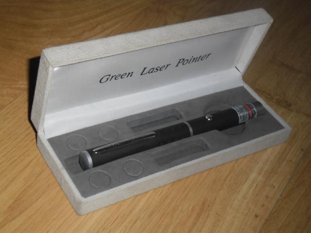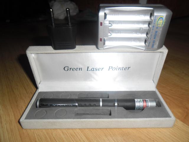50 milivatu lazeris šviečiantis žaliai su dėžute ir baterijų įkrovėju.