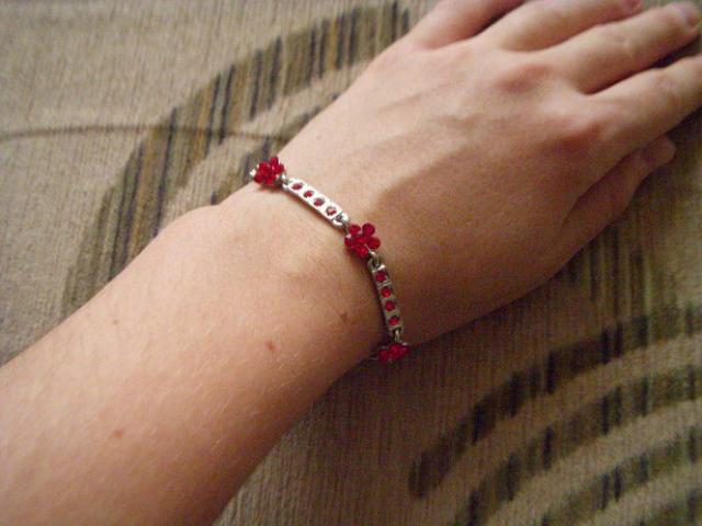 Ne karto nedeveta grandinele ant rankos is raudonu akuciu, puosni