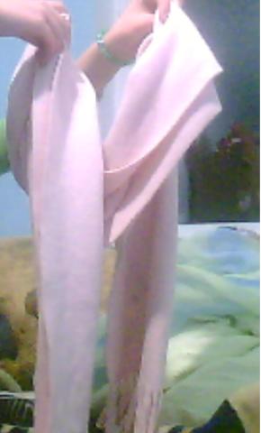 Kokių 2 metrų ilgio ir 40 cm pločio šviesiai ružavas šalikas.Galima apsivynioti dviem eilėm ir dar liks :D